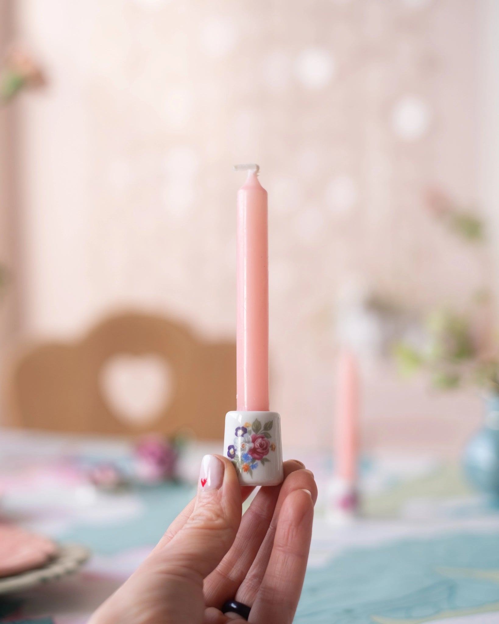 Accompagnés de leur bougie rose, 2 motifs différents sur chaque bougeoir.