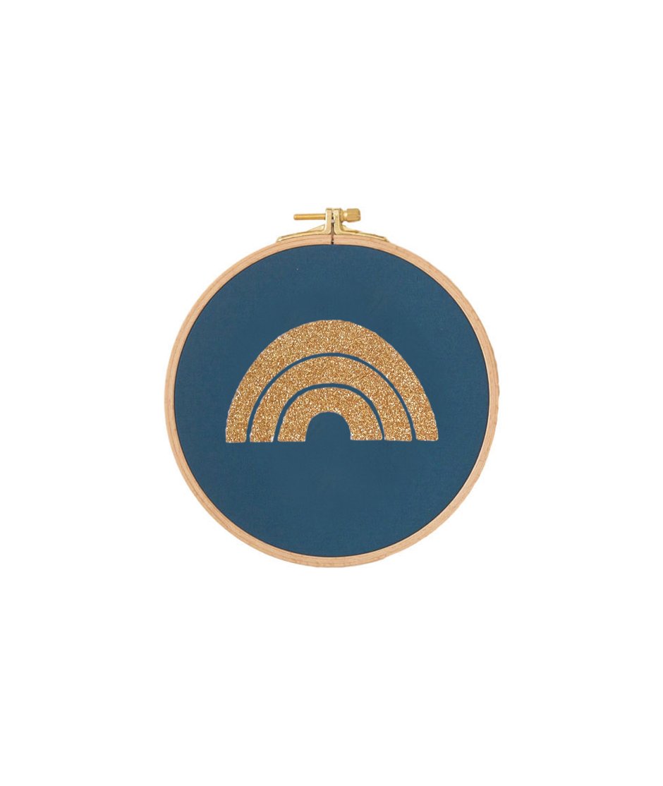 Il comporte un arc en ciel au milieu d'un tissu uni.