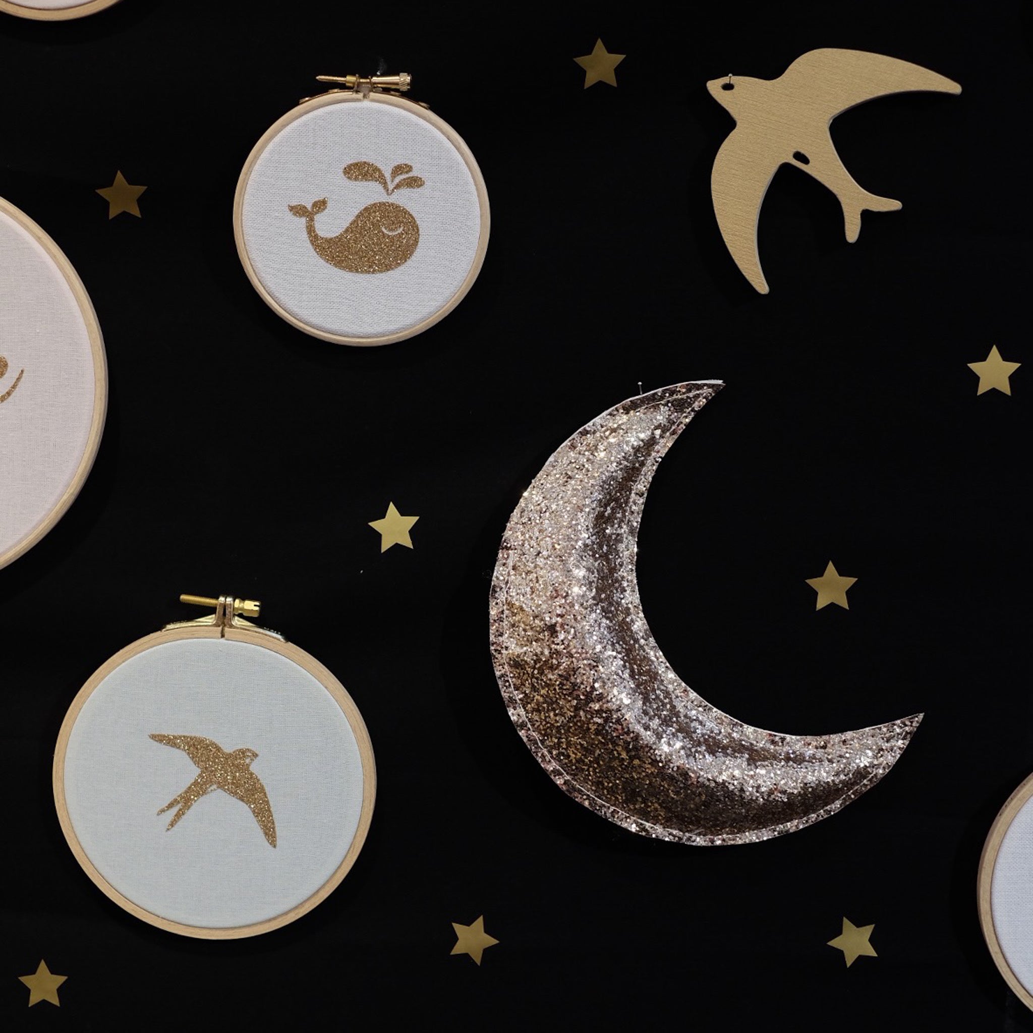 Le tissu du fond est noir ou bleu nuit et les motifs sont dorés et pailletés.