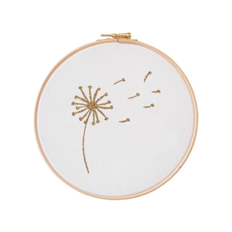 Il comporte un pissenlit au milieu d'un tissu uni.
