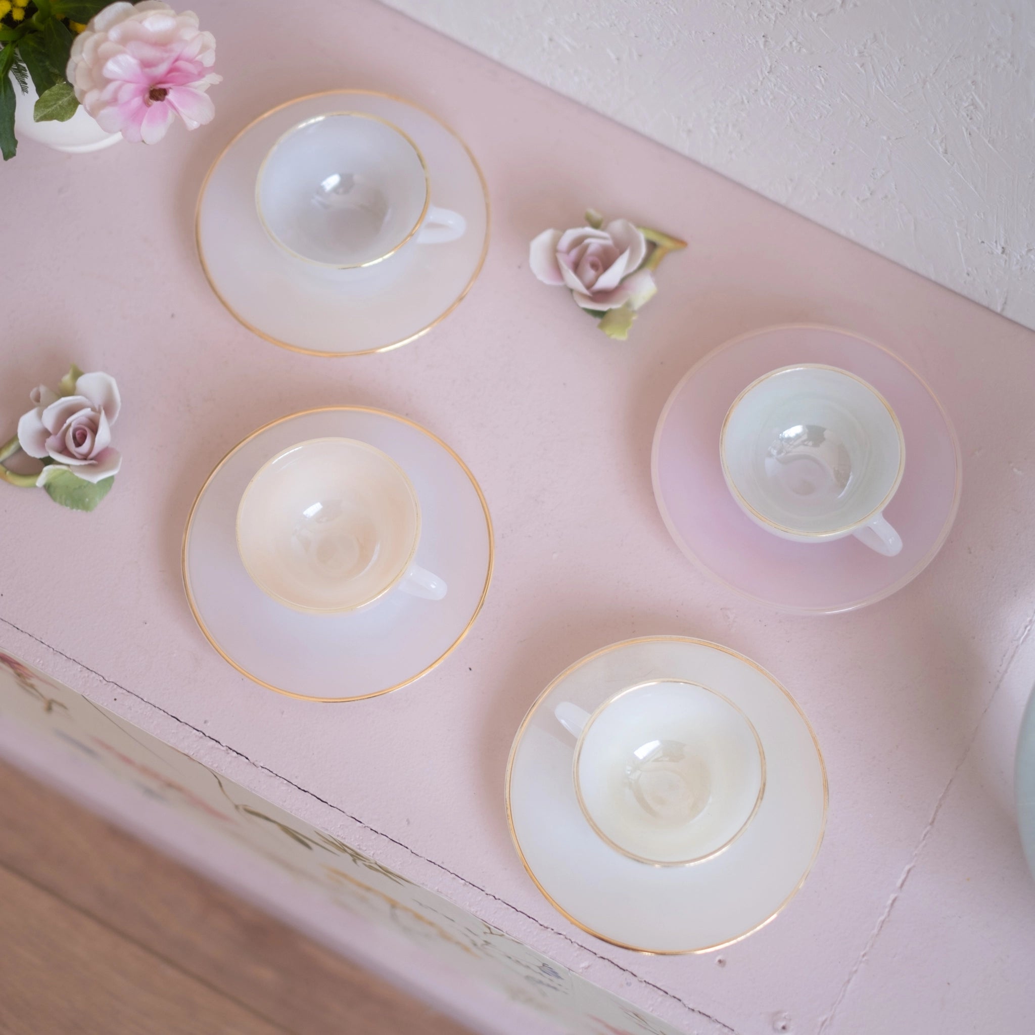 4 tasses à café en opaline avec leurs coupelles fabriquées par Arcopal dans les années 70.