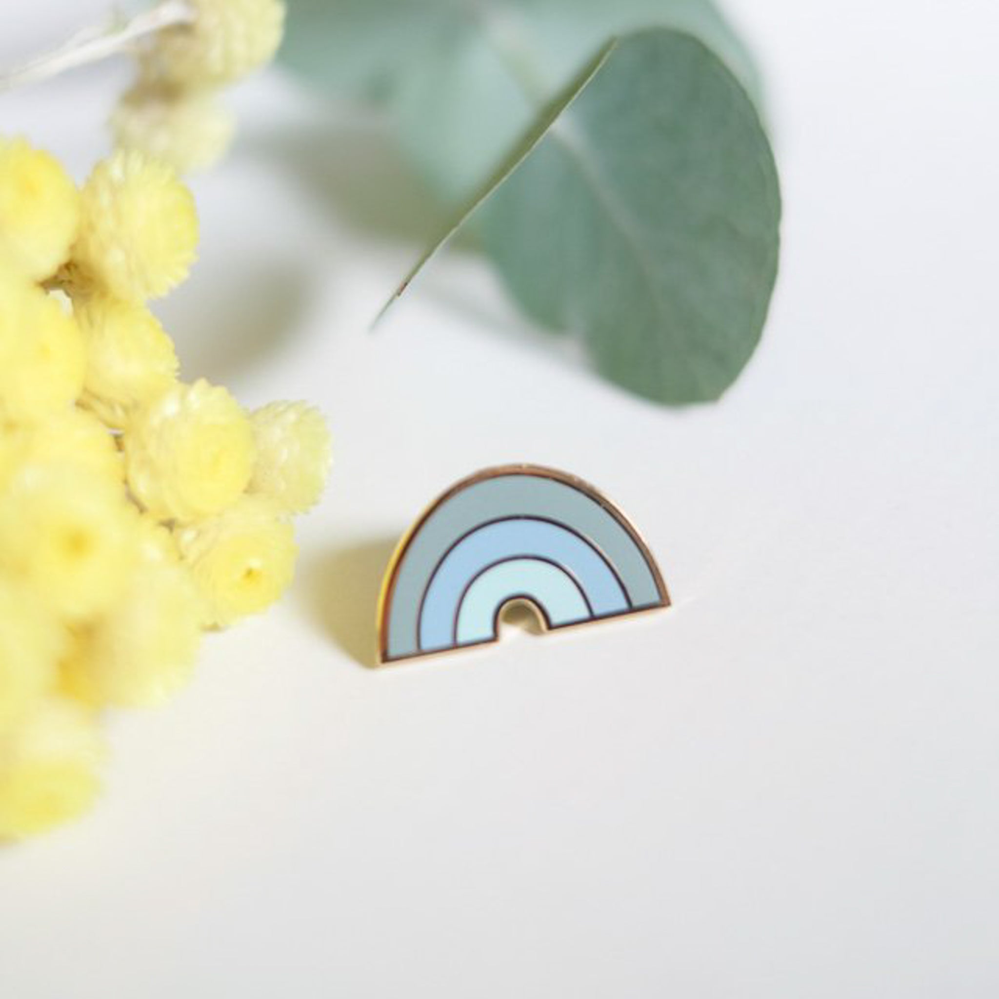 Un pin's arc en ciel en métal dans des teintes de bleu et vert mint..