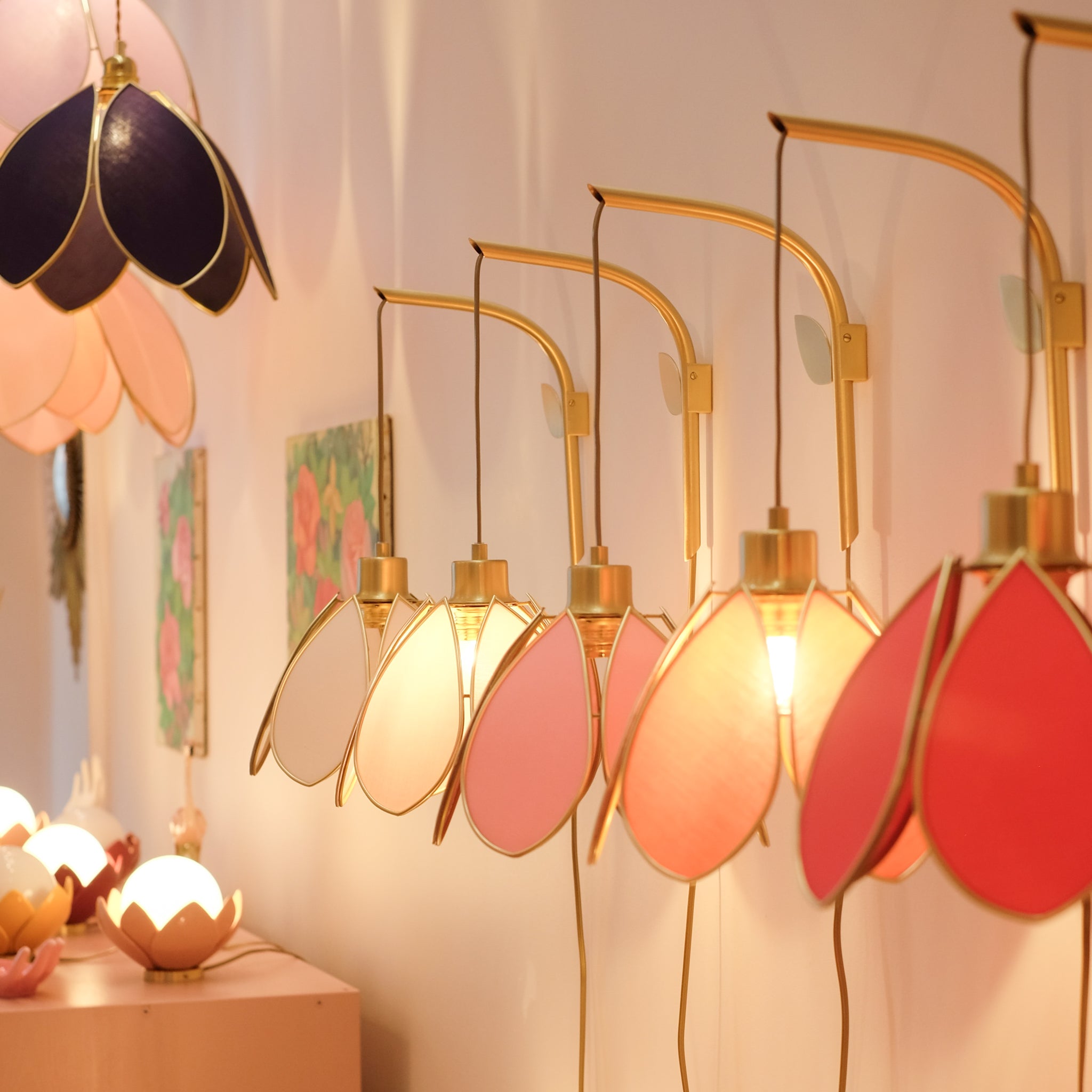 Toutes nos lampes fleurs sont fabriquées en France. Les armatures en métal doré proviennent d'une petite usine dans l'ouest de la France et nous les habillons à Villeurbanne, dans notre atelier.Les lampes Iva, ainsi que les pieds de lampes fleurs et les supports de baladeuse en laiton, sont fabriqués au Portugal.