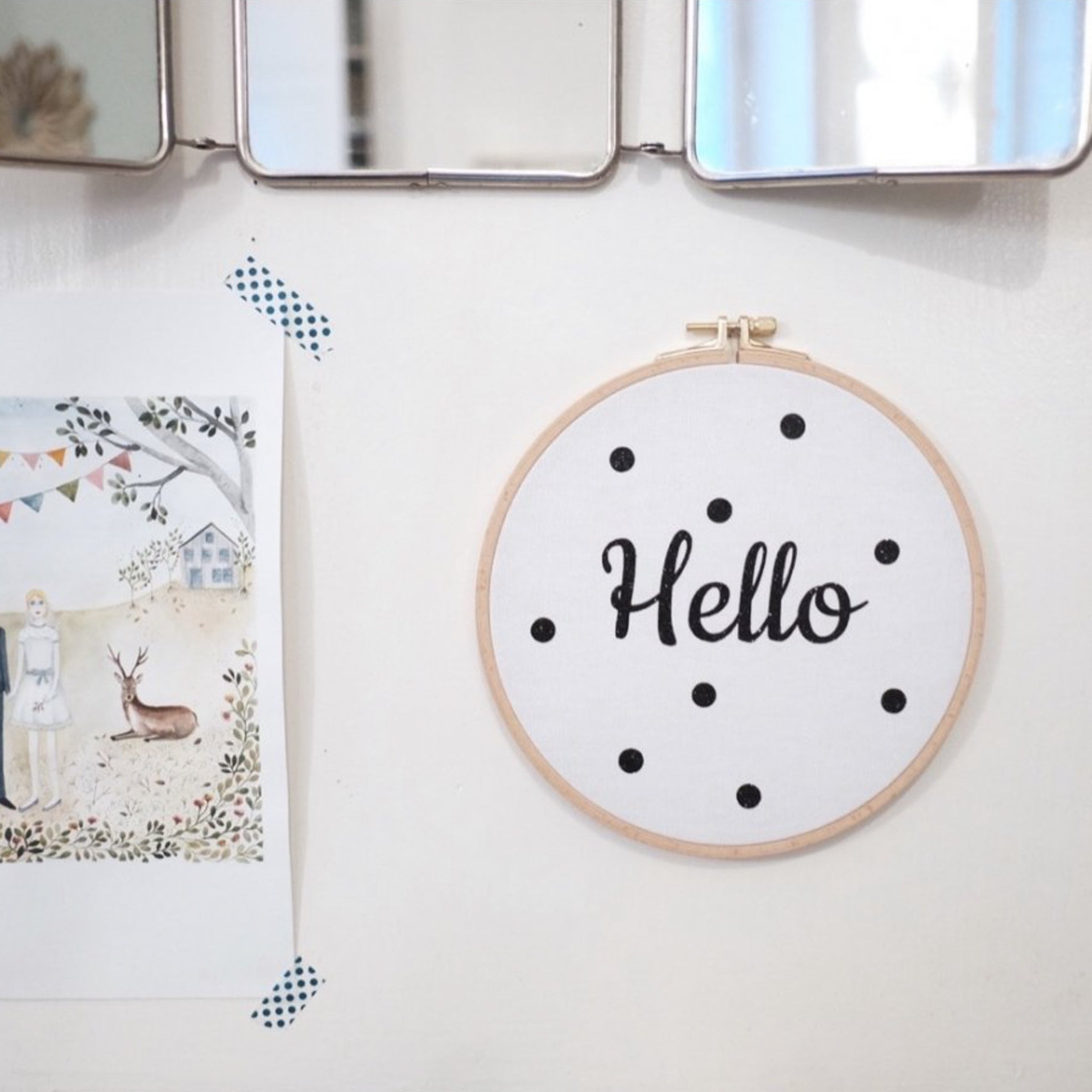 Cadre en bois et tissu réalisé à partir d'un tambour à broder.